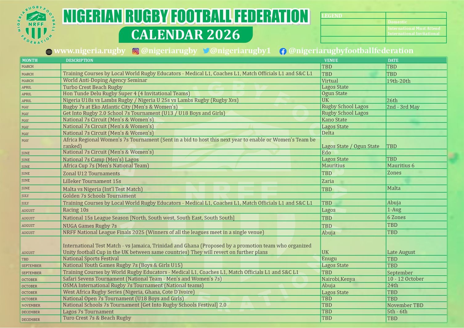 The Nigeria Rugby Football Federation (NRFF) has unveiled its 2026 calendar of activities, outlining an expanded domestic competition structure and renewed commitment to women’s rugby development. The federation says the roadmap is designed to strengthen grassroots participation, youth pathways, and Nigeria’s competitiveness in both the 7s and 15s formats across Africa.